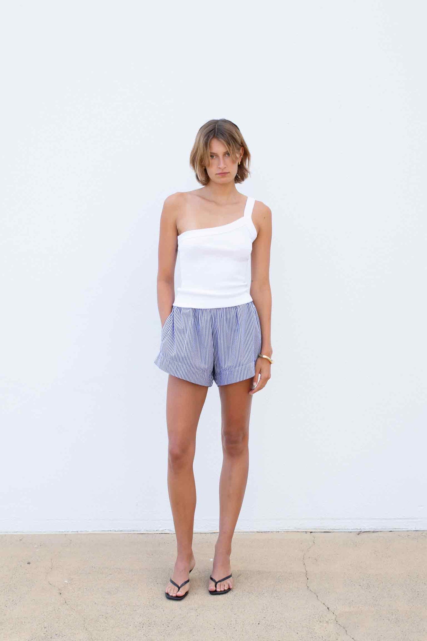 A high-waisted relaxed short with slight raised side hem and pockets. Made in a lightweight, textured seersucker blue and white stripe, the Quai Shorts are a versatile yet comfortable option from day to night.